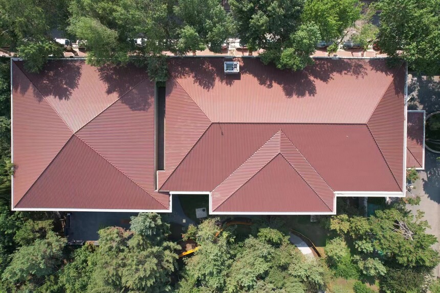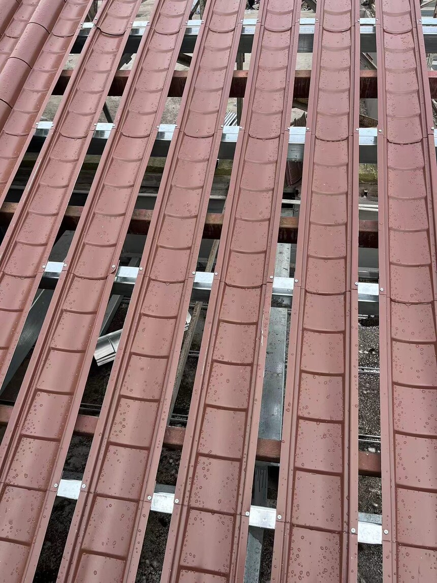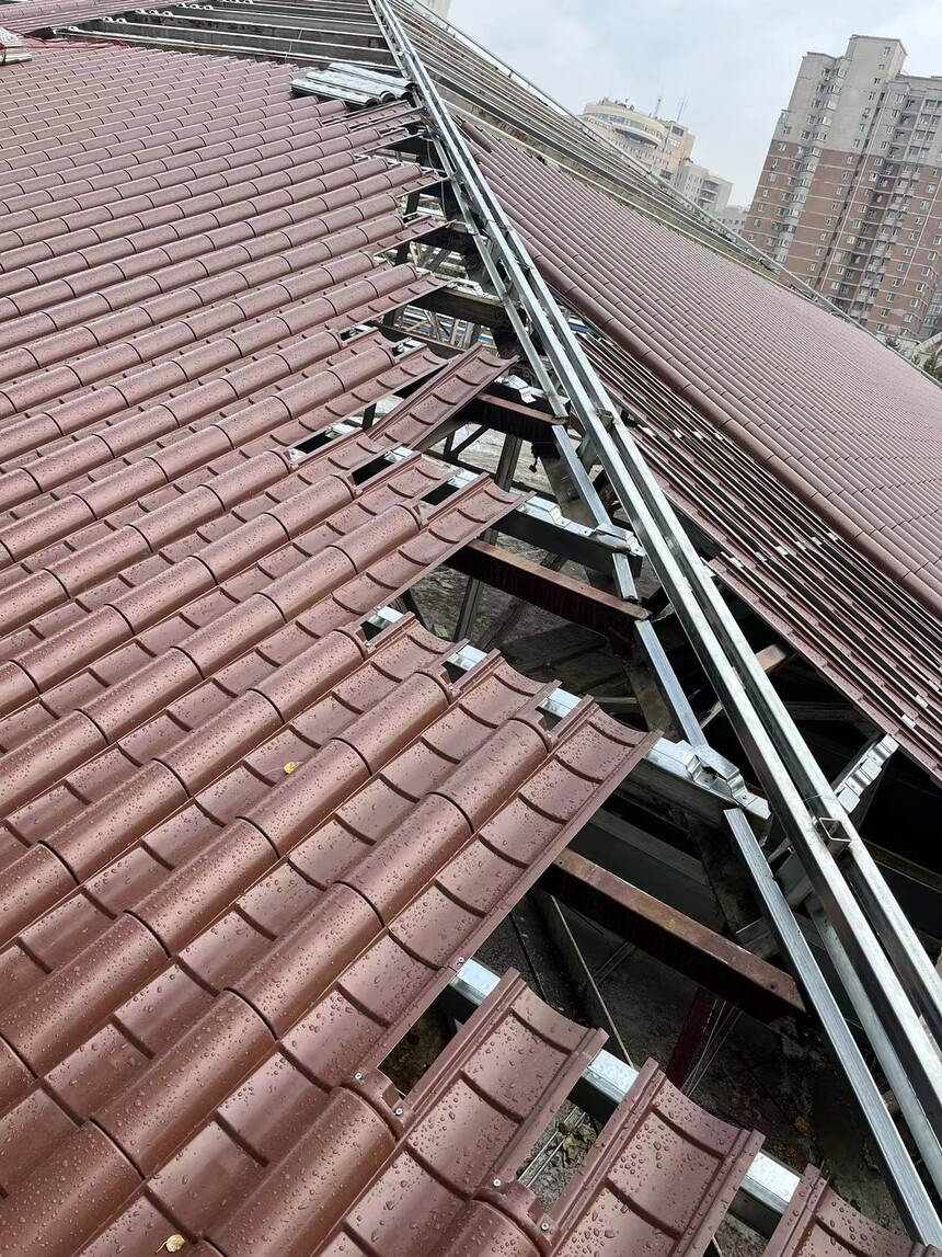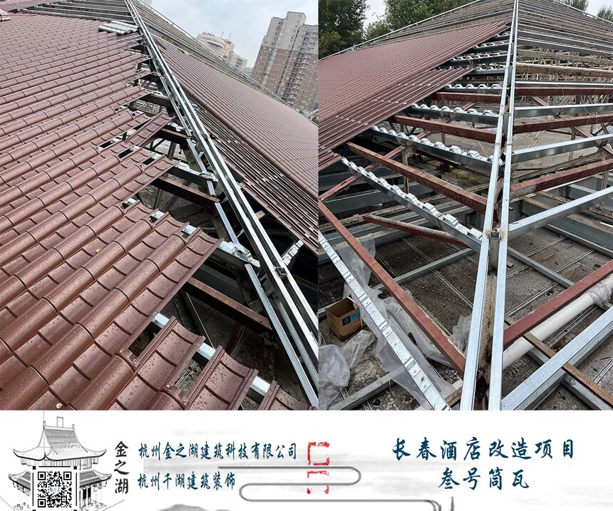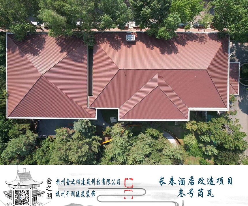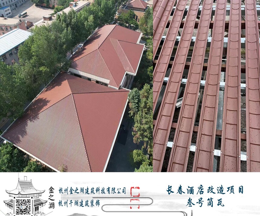 该长春宾馆项目为改造翻新屋面,采用杭州金之湖公司生产3号仿古分体筒瓦。整体屋面安装简单,效果美观。